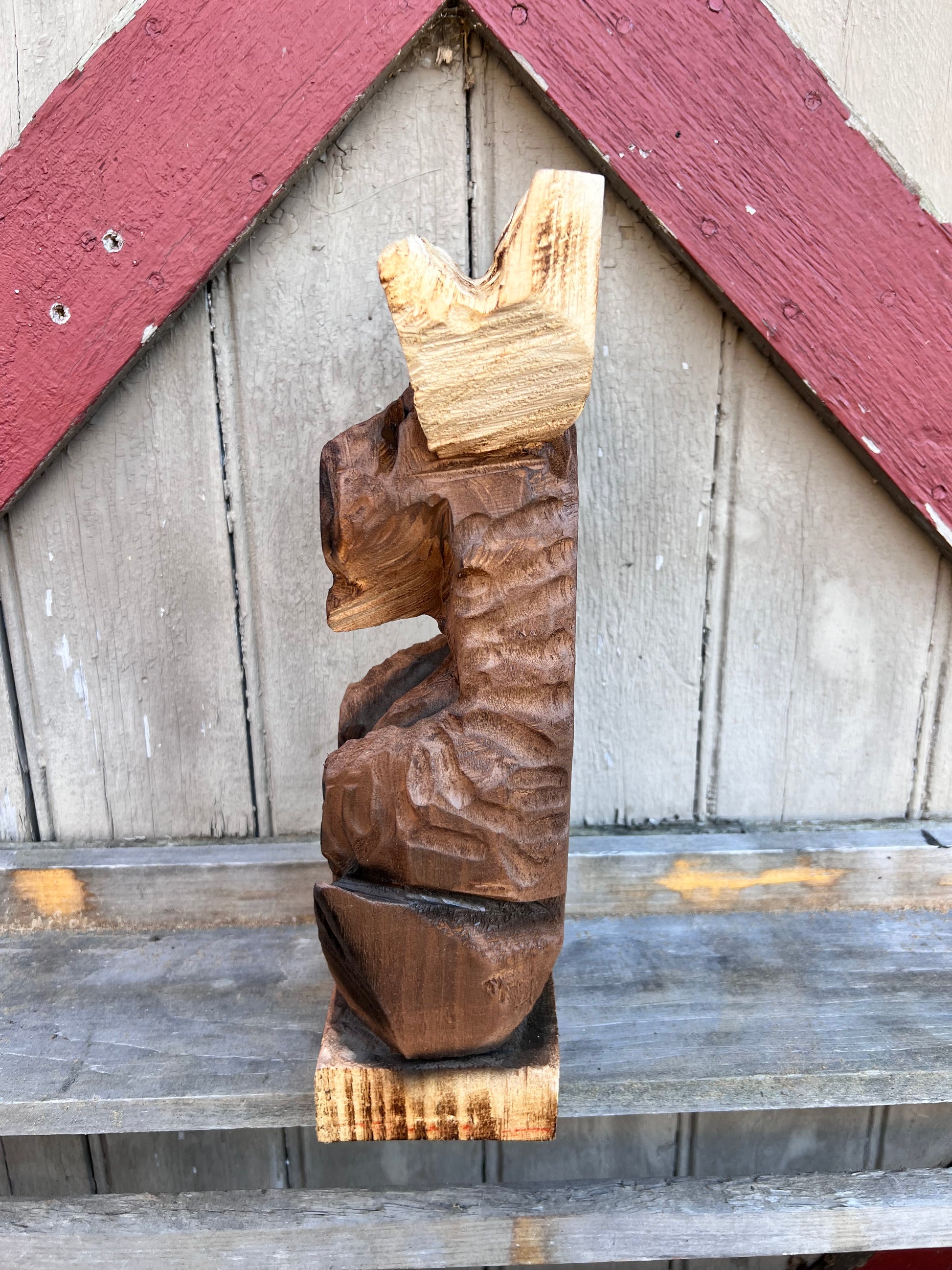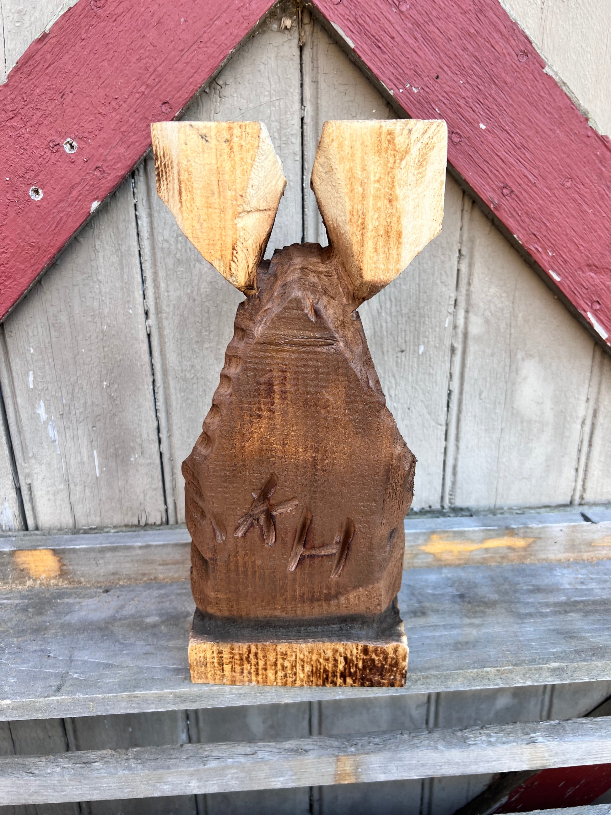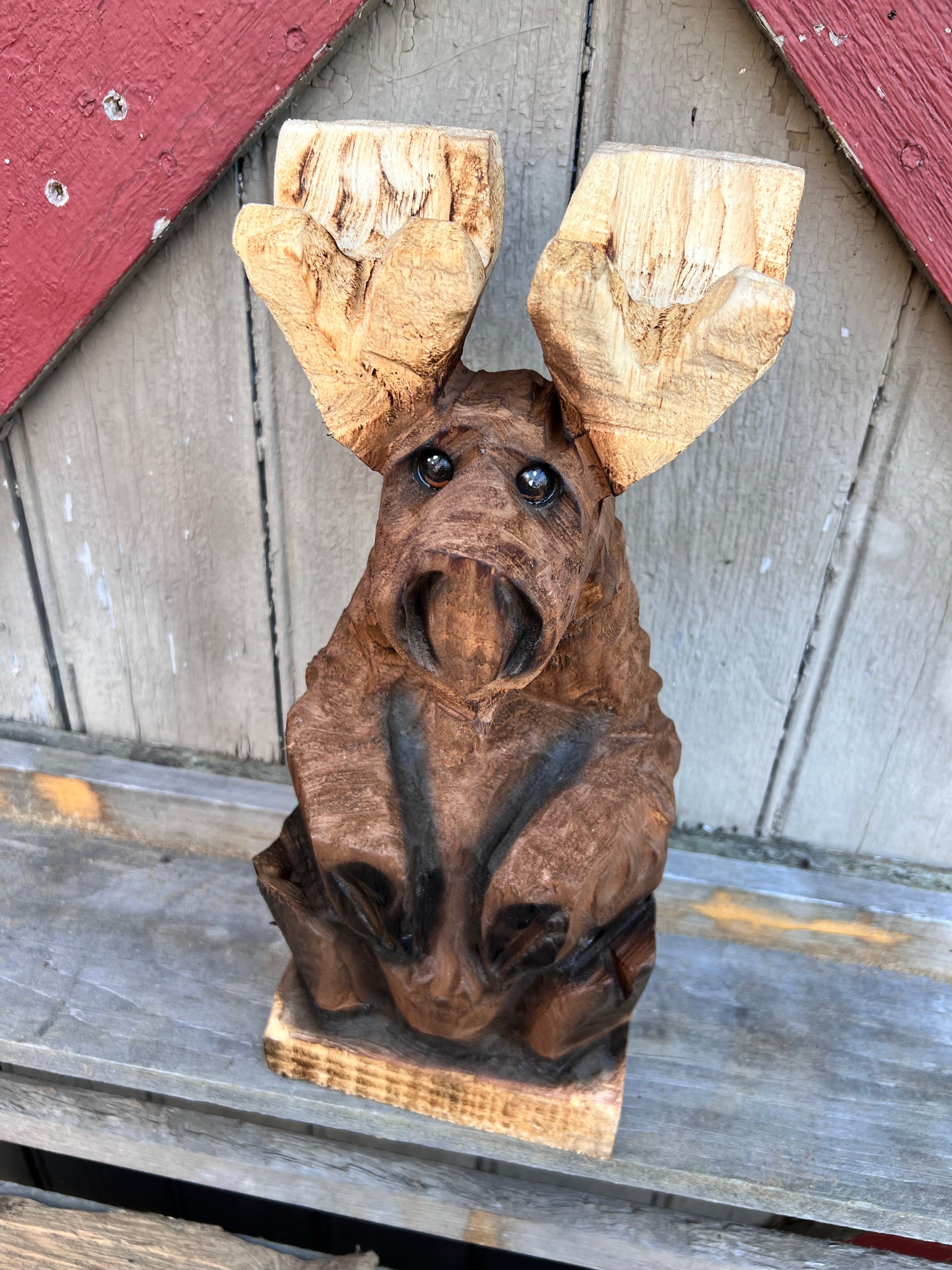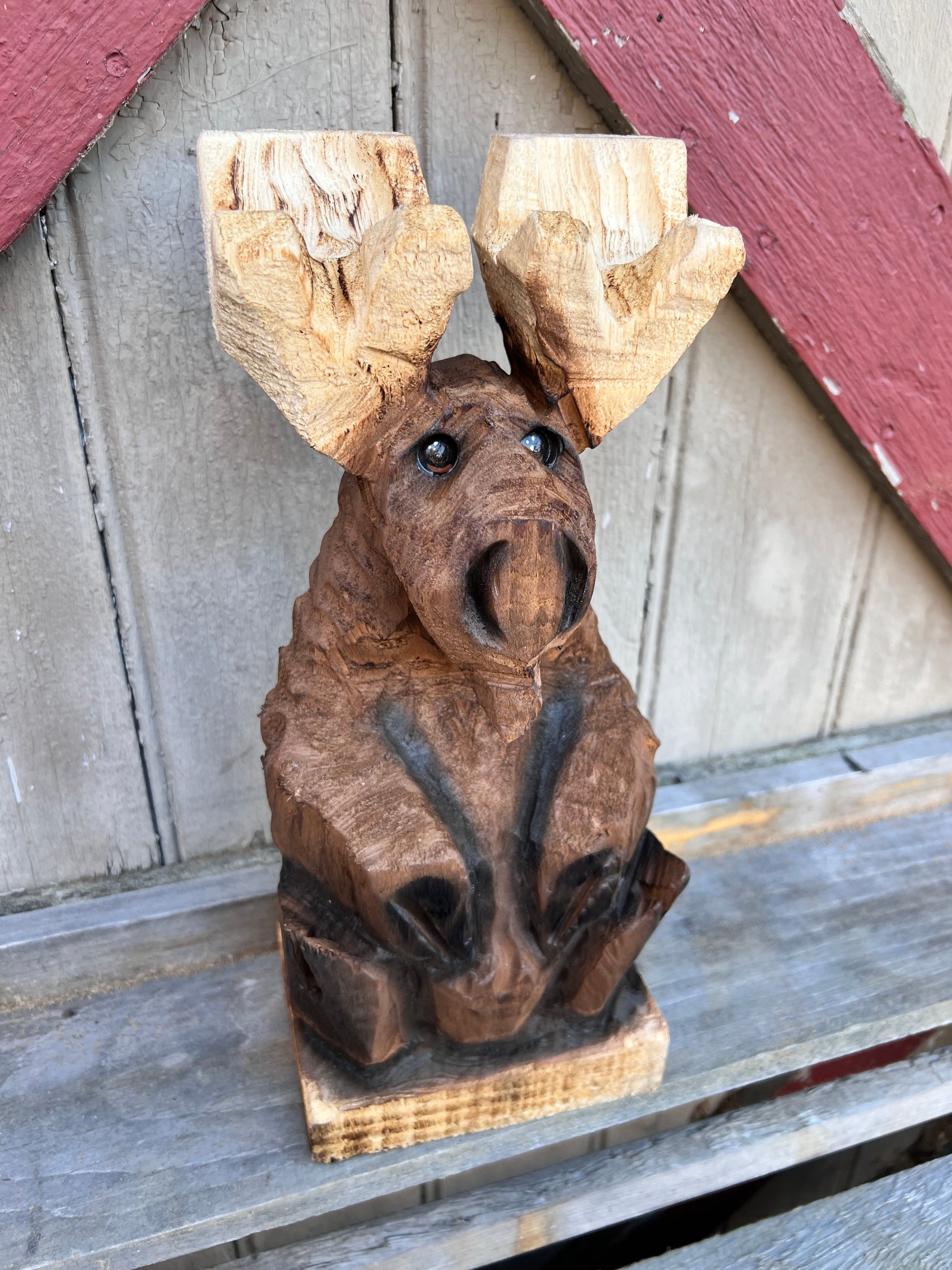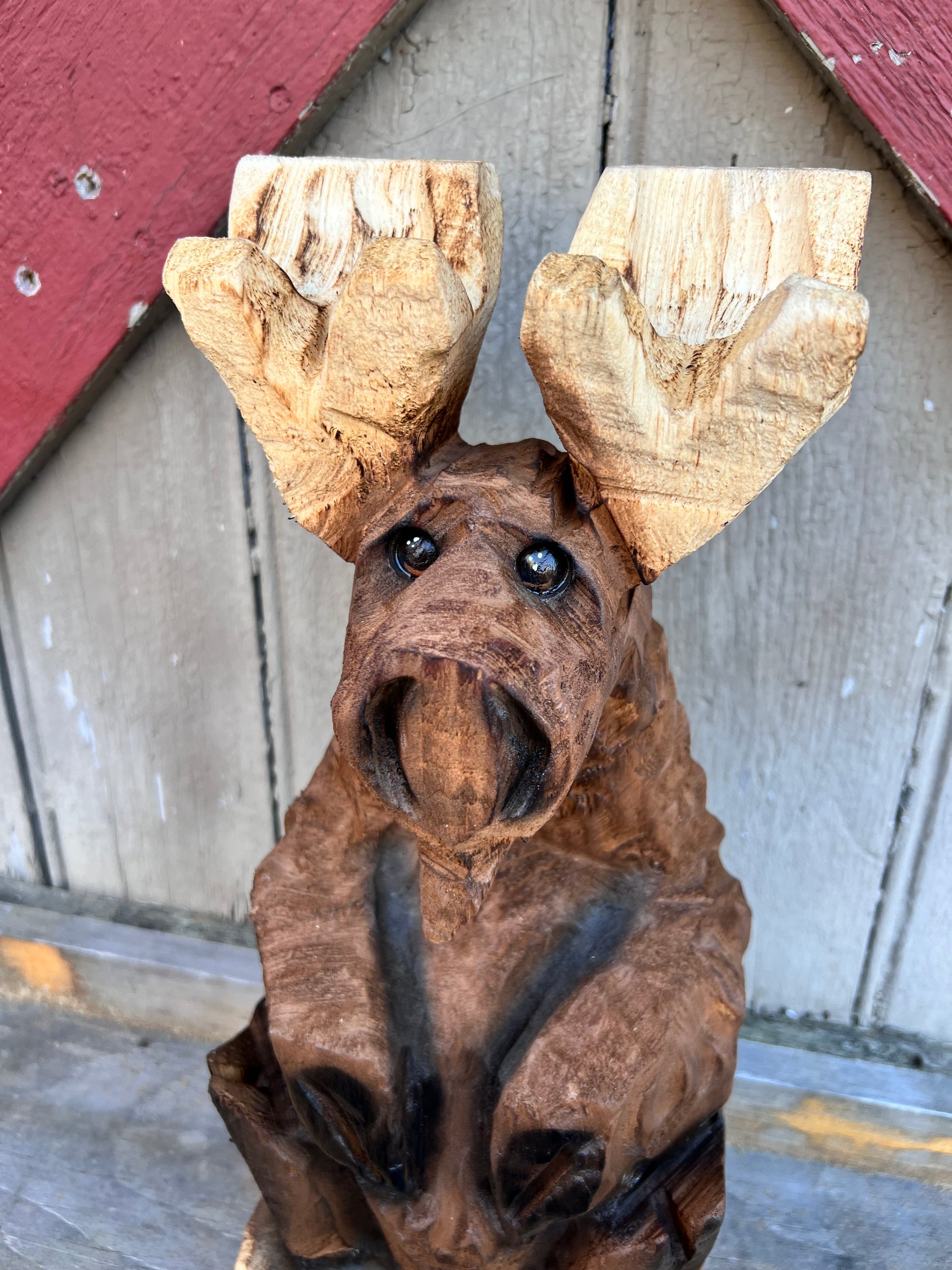 This cute moose was carved with a chainsaw and detailed with power carving tools . He is carved from pine and have been finished with a brown paint , airbrushed for details and has an exterior finish .
