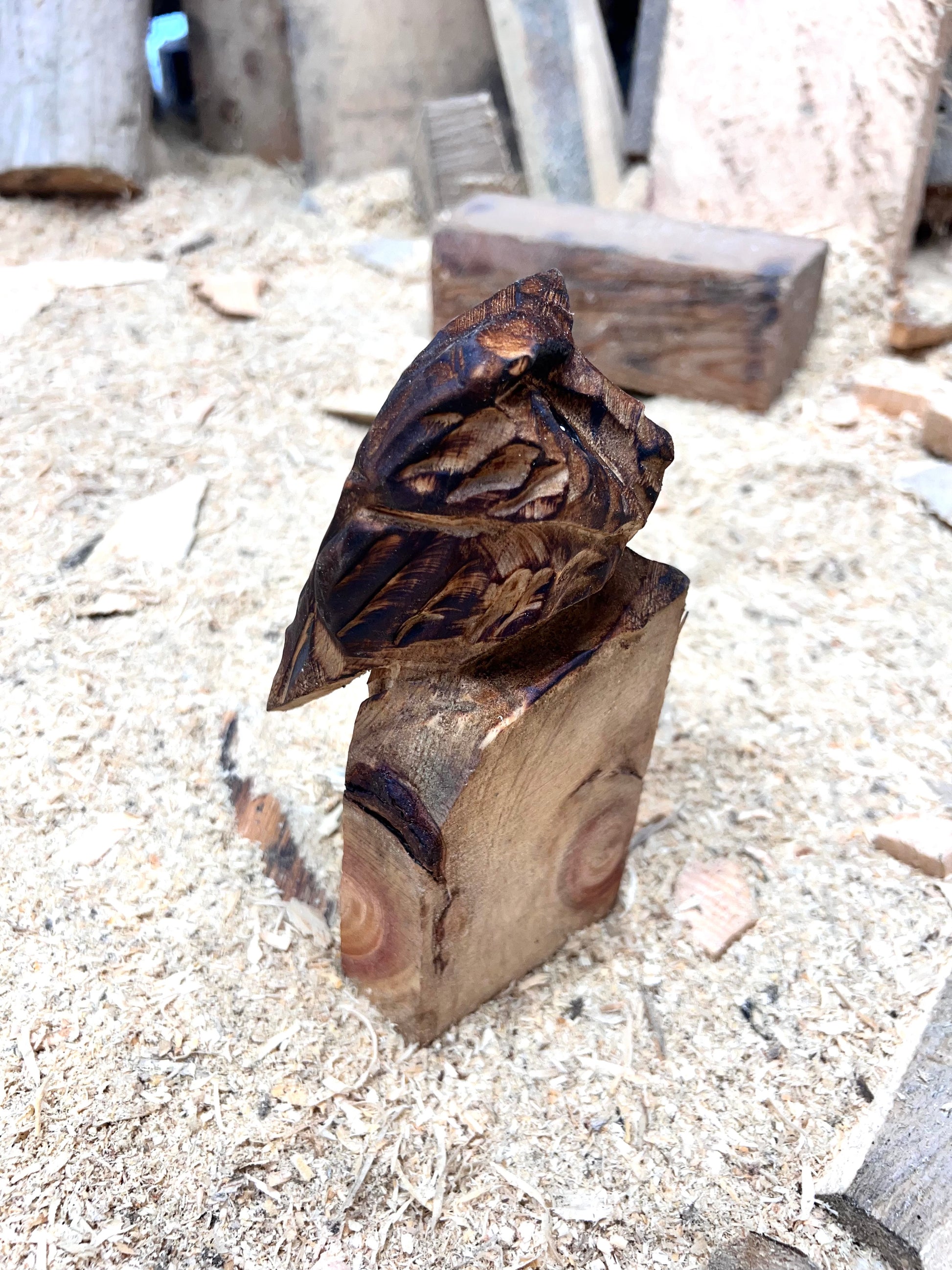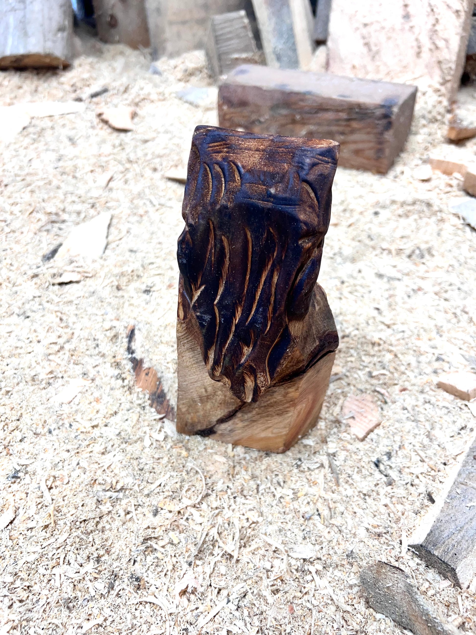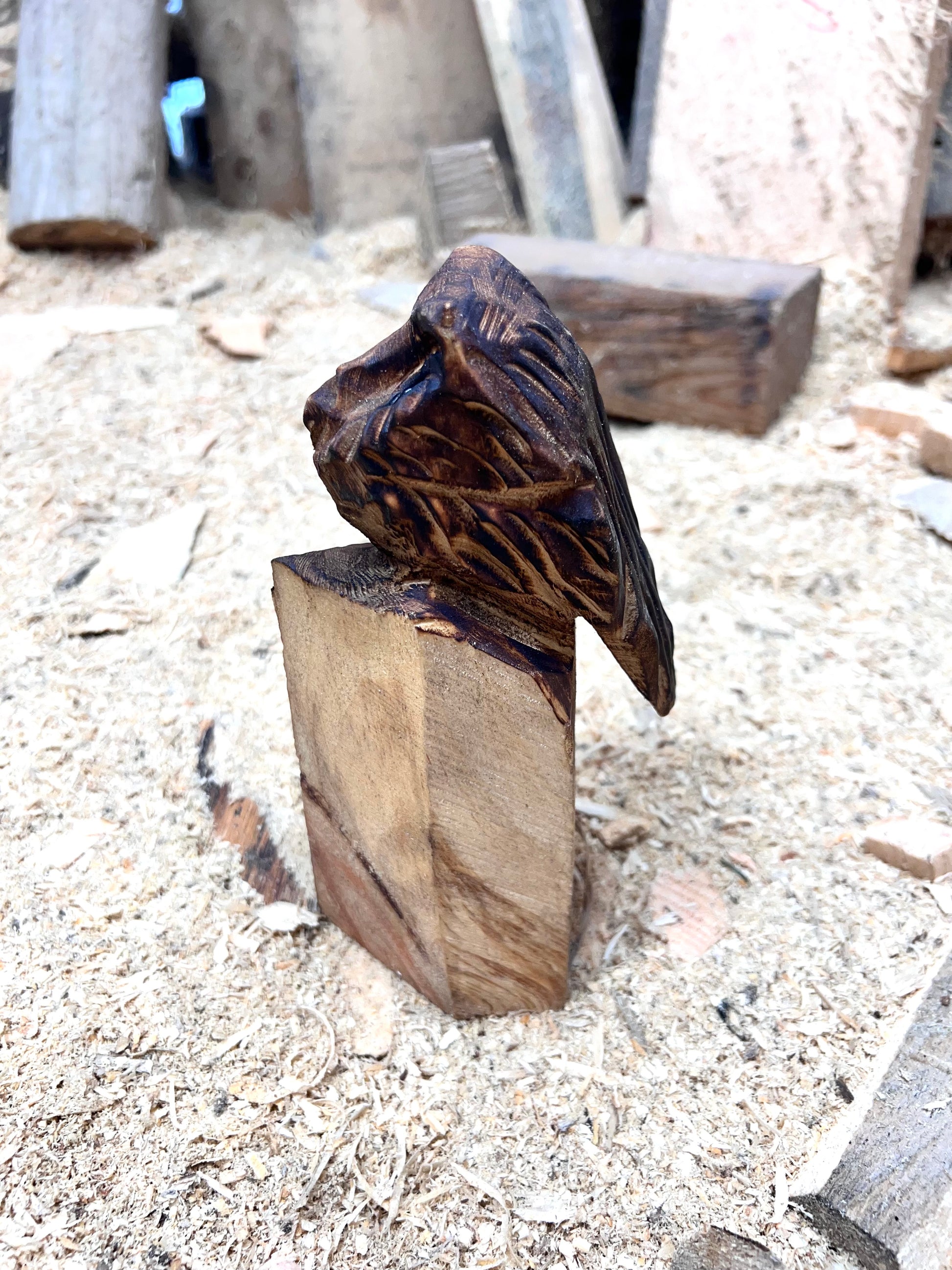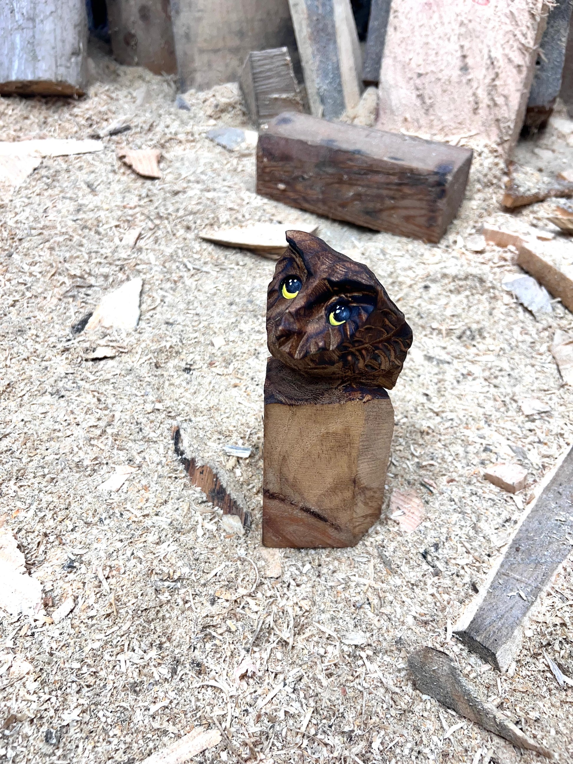 This adorable little owl has been intricately carved and detailed using a chainsaw and power tools. The hand-painted eyes and charred coloring give the piece a unique and rustic charm. Each owl stands approximately 8 inches tall and measures 3 inches by 3 inches at the base. Orders are now being accepted for these darling creatures, though please note that the owl you receive will be similar but not identical to the one pictured, as each is individually crafted upon ordering. Thank you for supporting our small business, The Halls.